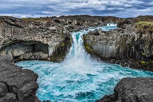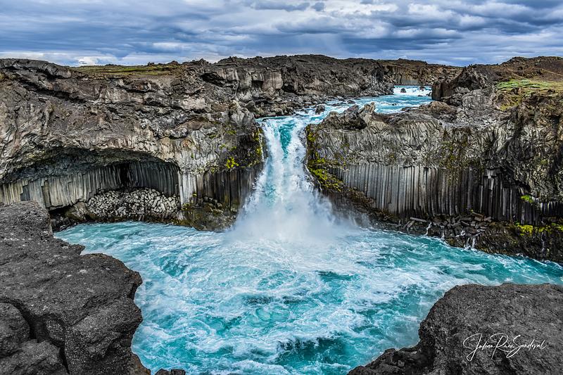 Una remota cascada en las tierras altas islandesas en los meses de verano, rodeada de increĆ­bles columnas de basalto